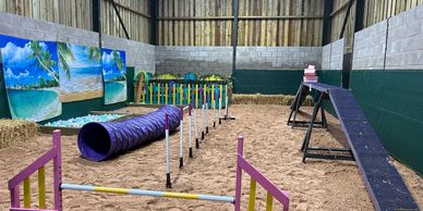 The barn is laid with fine-grade silica play sand, giving a soft, natural surface that’s perfect for zoomies. Inside you’ll find plenty to keep tails wagging, including a ball pit, sand pit, agility tunnel, jump, and even a dog walk for extra adventure.